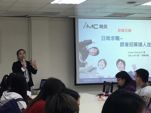 本校生涯發展中心近期舉辦系列企業徵才說明會,108年3月15日由IMC 精英人力資源公司招募經理江瑩為本校學生介紹求職的詳情。IMC 精英人力資源已成立28年,服務據點擴及全臺,主要服務項目為協助國內外企業徵才;主講人江瑩,留學日本期間與當地職場接軌,曾任職於迪士尼大使飯店,具有日商企業的豐富資歷。