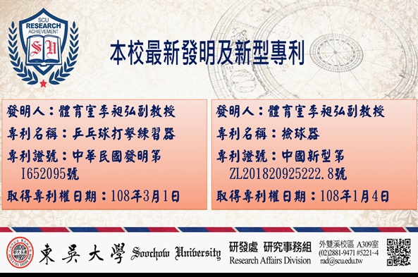 本校最新獲得發明專利兩件,均為體育室李昶弘副教授自行研發成果,分述如下: