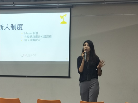 說明會最後,Emily專員也與大家分享台灣微告的福利制度,強調公司會有良好的教育訓練制度,新人不用擔心會跟不上進度。非常歡迎勇於挑戰、喜歡嘗試、願意學習及具抗壓性的學生能夠加入台灣微告。