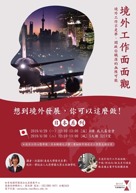 「好想去日本工作,可是我不會日文怎麼辦?」、「日本的職場有什麼特別的文化?」一開始聽到去日本工作,許多人心中可能會浮現出這些問題。為了幫學生解惑,本校生涯發展中心於2019年4月30日,邀請曾在本校學生事務處服務10年,現任職於學校法人大原學院大原日本語學院的校友沈蘭傑學姐回來,以「境外工作面面觀」為題,分享她這幾年在日本工作的經驗與心得。