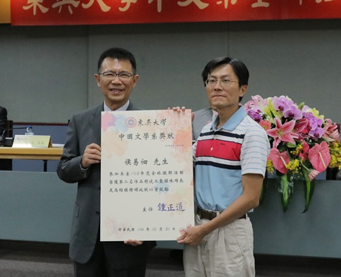 中文系鍾正道主任隨即公布本屆「2019東吳大學中文系全球徵聯活動」前三名得主,第一名為許瀞元女士「九州分野時興時衰時兼併」;第二名為侯易佃先生「一中各表可爭可談可相助」;第三名為許舒閔小姐「三權分立兼衡兼容兼相輔」,由馬英九前總統頒發第一名獎項,潘維大校長頒發第二、三名獎項。頒獎儀式後,請馬前總統公布下屆全球徵聯活動之上聯「周亡鼎秦失鹿問鼎逐鹿不謀私利」。