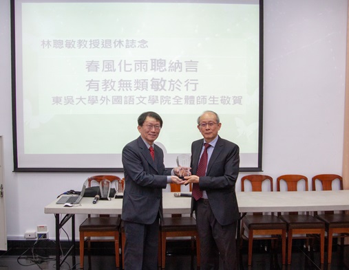德文系林聰敏教授為本校德文系系友,1987年應楊其銑故校長之邀,返母校任教於德文系,迄今已歷32年。林老師研究領域為教育學,在學生眼中的他,是一位願意耐心聆聽學生各種疑難雜症的師長,且樂於與學生溝通、了解學生的問題與需求並給予協助,在校服務期間除擔任德文系主任外,2002年至2005年亦擔任外語學院院長一職,任內推動學院聯合研究生論文發表會、推廣各學系辦理異國文化活動、訂定學院各委員會設置要點及辦法,為學院後續的發展奠定良好的基礎。林老師即將在108學年度第一學期結束後退休,外語學院特致贈「春風化雨聰納言/有教無類敏於行」水晶紀念講座,感謝林老師30餘年來對校、院、系以及學生們的付出與指導。