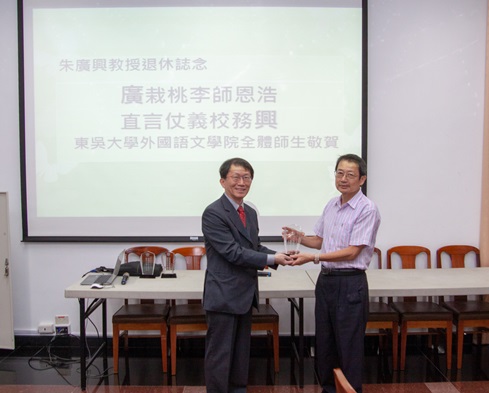 日文系朱廣興教授為本校日文系系友,1991年起任教於日文系,迄今將近29年。朱老師研究專攻社會語言學,且教學生動風趣,經常結合時事,並熱心參與學系活動及學生輔導,曾擔任本校日文系主任,並於2004年承接外語學院代理院長一職。朱老師長期秉持公平及正義的理念,為本校教職員工及學生爭取權益及福利不遺餘力,外國語文學院特致贈「廣栽桃李師恩浩/直言仗義校務興」水晶紀念講座,謝謝朱老師的付出與貢獻。