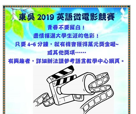 本校外國語文學院建院35週年慶祝系列活動,由語言教學中心以推動校園自主學習英語風氣,提升學生口語表達能力、創意及自信為目的,規劃「東吳2019英語微電影競賽」活動。參賽者須為東吳大學大學部或研究所學生,可個人或跨系組隊報名。有興趣者,詳細辦法請參考語言教學中心網頁。