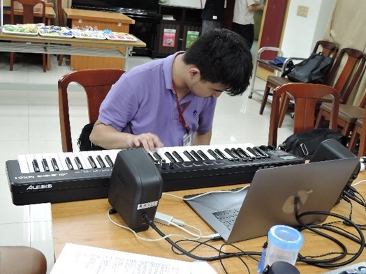 經過了上午課程及劇本緊鑼密鼓的討論,下午便是出外拍攝的時間,豔陽熾熱烘烤著,依然不減學生們拍攝的決心,即使揮汗如雨,在熱浪中腳步顯得有些沉重,學生們仍一次又一次的重覆拍攝,便是希望能在鏡頭前呈現最好的一面。本次拍攝分為A、B二組,A組的一大亮點為就讀英文系的視障生羅文謙,他本身從事電影配樂工作,此次活動由他接下A組影片配樂的任務;組員在外頭揮汗拍攝,他自己也不閒著,在室內努力的構思音樂。雖然B組拍攝起步較晚,但他們展現嚴謹力求完美的態度,拍攝出只屬於他們的獨特故事。