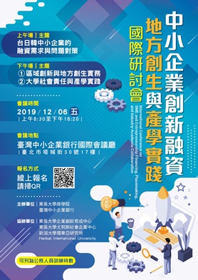 為此,本校商學院與臺灣中小企業銀行,於108年12月6日假臺灣中小企業銀行17樓國際會議廳共同主辦國際研討會,廣邀台、日、韓的中小企業金融專家、地方創生及大學產學實踐傑出團隊以及產官學專家進行演講與討論。此外,會議亦特別邀請日本地域創生大師—谷中修吾先生進行專題演講。