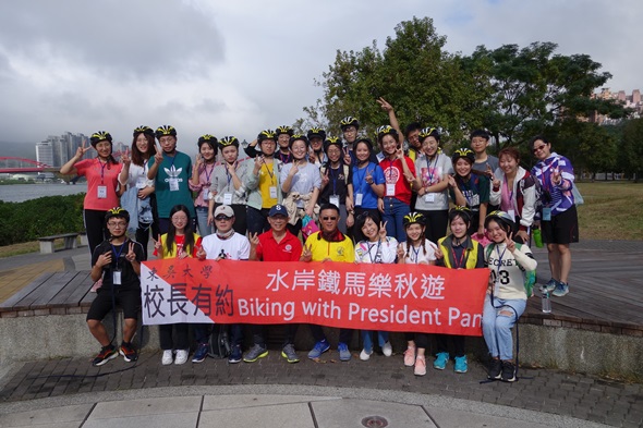 本學期的「校長有約─水岸鐵馬樂秋遊」活動,於11月23日盛大舉行,由潘維大校長親自領軍,帶領約100位境外生一同騎乘自行車,挑戰來回共計50公里的水岸自行車道。董保城副校長、王世和學術交流長、兩岸中心王玉梅主任以及來自大陸的訪問學者高雁老師、鄭州大學張亮老師、福州大學唐斌湖老師、山東科技大學劉兵老師、蘇州大學錢錫生老師、曲阜師範曹春茹老師、華僑大學葉小蘭老師、北京外國語大學楊桂蓮老師、西北政法大學孫政偉、李雅萍及杜國強等11名老師也共襄盛舉。潘校長希望透過此活動讓來自世界各地的境外生感受到東吳的溫暖和活力,創造專屬學生們的難忘回憶。