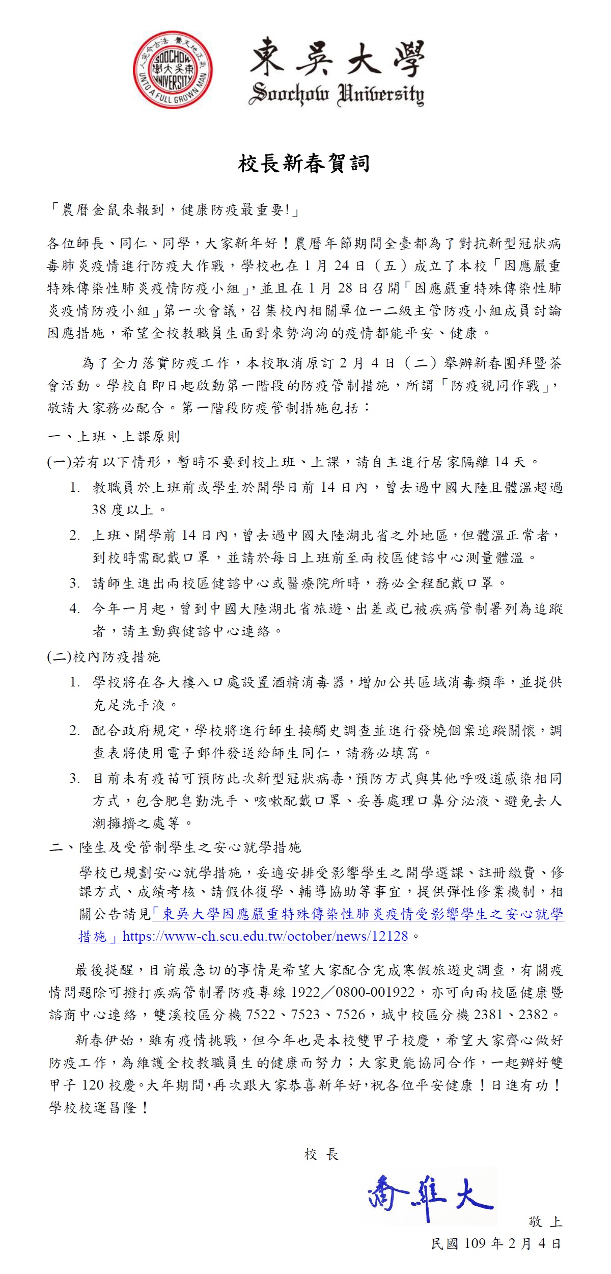 因應嚴重特殊傳染肺炎疫情,學校積極預防校園群聚感染,決定108學年度下學期延後至3月2日開學,希望大家齊心做好防疫工作,為維護全校教職員生的健康而努力,並且協同合作辦好本校雙甲子120校慶。
