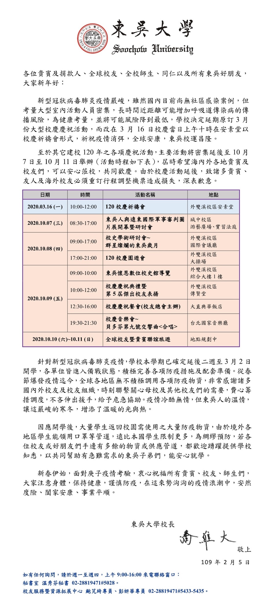 為因應嚴重特殊傳染性肺炎疫情,學校原訂今年3月份舉辦建校120年校慶典禮等主要慶祝活動,將延期至10月7日(三)至10月11日(日)舉行,另規劃於3月16日(一)校慶日上午10時在安素堂以祈禱會形式進行,祈祝疫情早日消弭,全球安康,校運昌隆。其它建校120年之各項慶祝活動舉辦日期,待各活動單位研議確認後,亦將於本校網站公告。