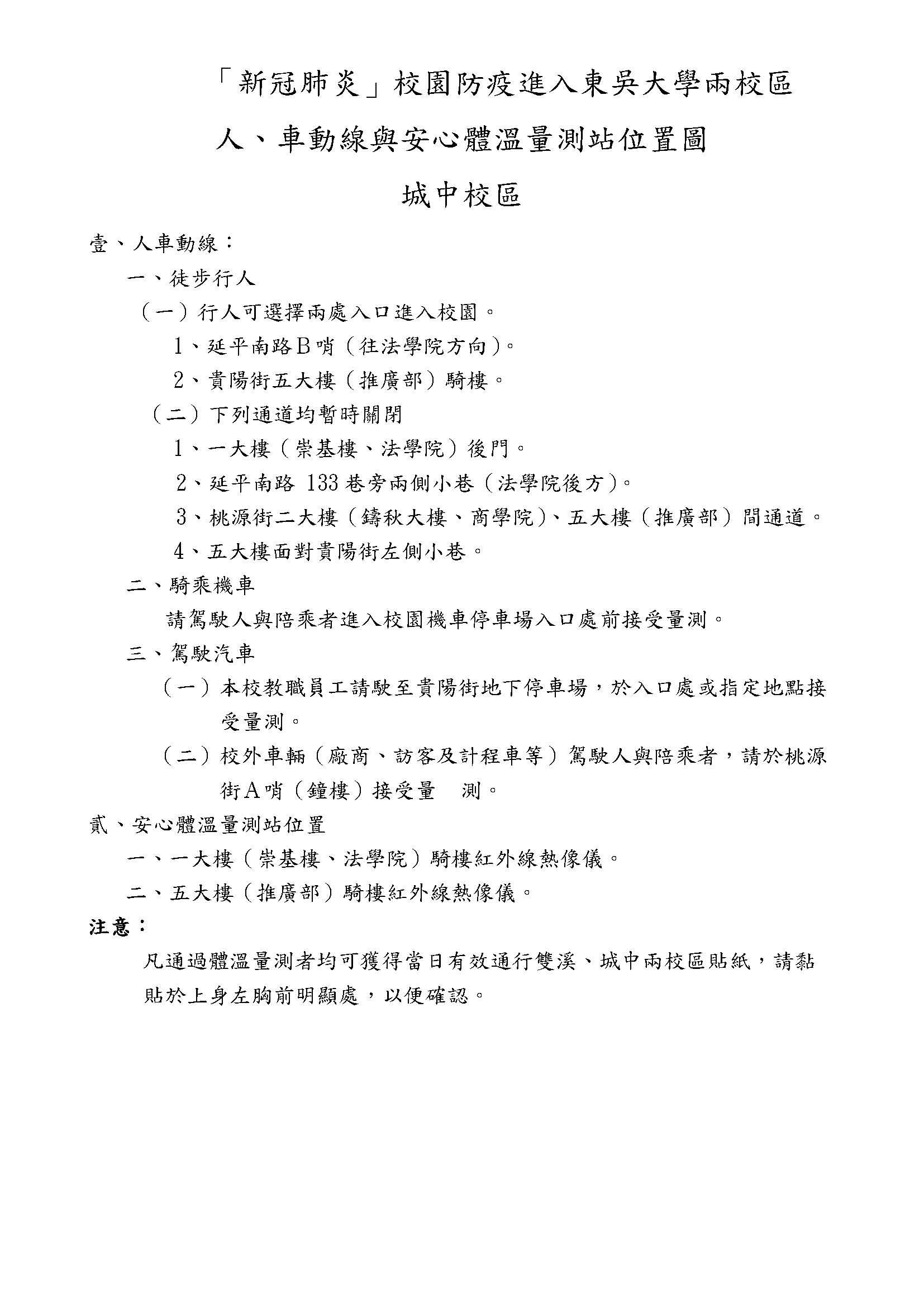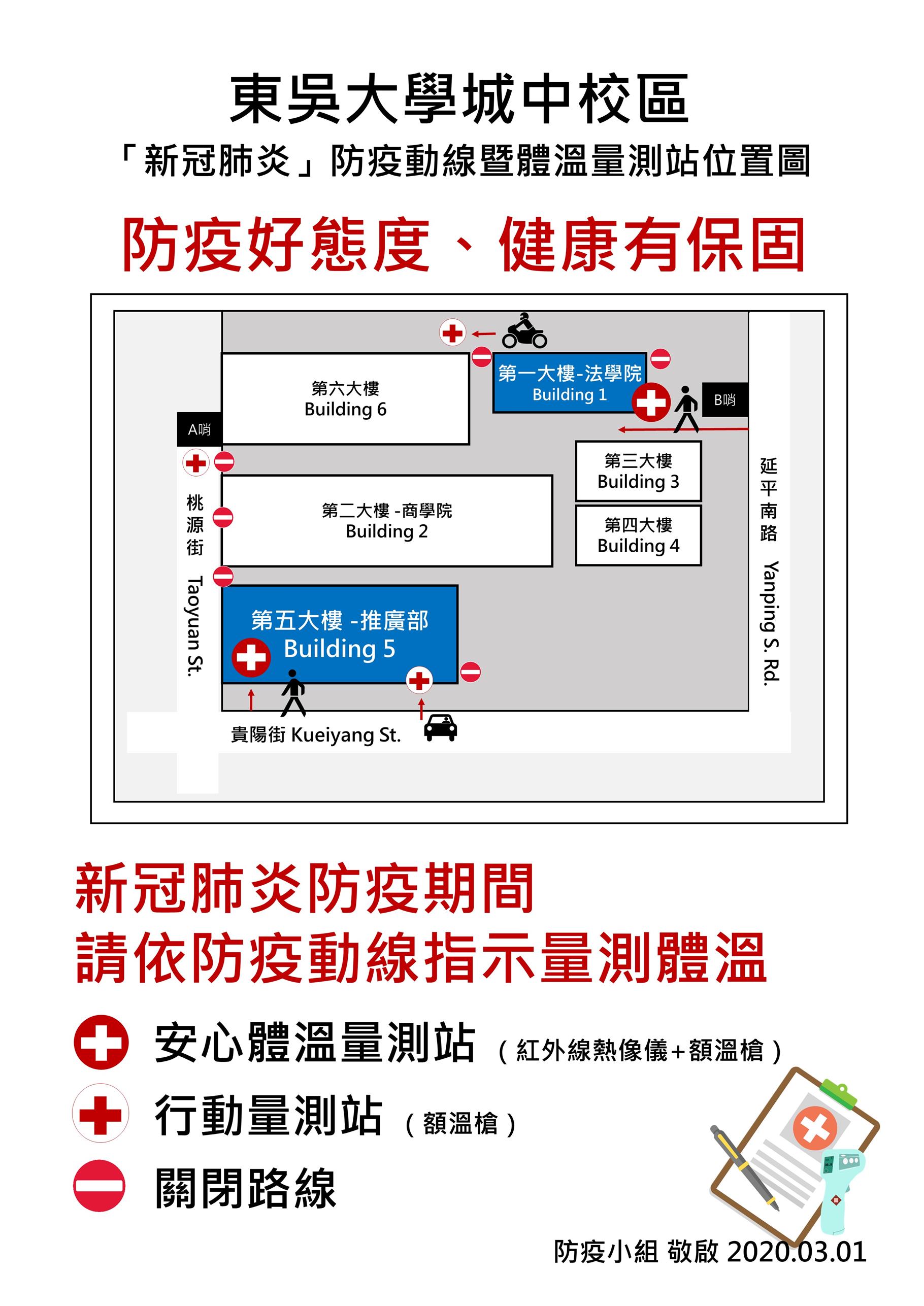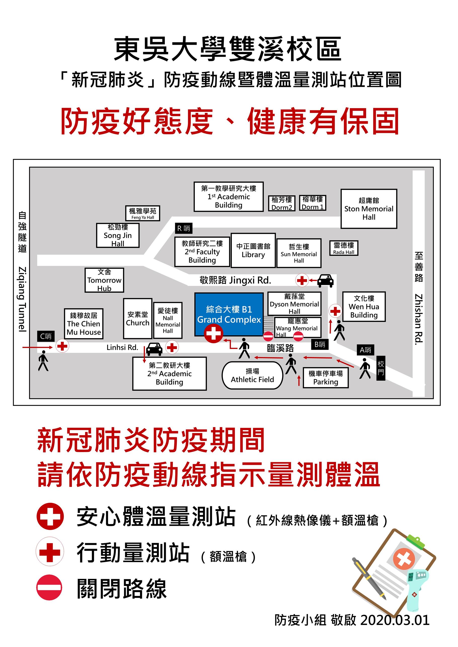 為了有效防止疫情,在校長潘維大帶領下的防疫小組決定於開學(3月2日)當天即啟動機制(詳另件),兩校區校園防疫動線與安心體溫量測站,亟需各位同學、老師、職工積極配合,造成各位不便,尚請見諒。