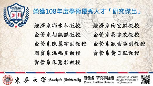 「研究傑出」:日文系賴錦雀教授、數學系簡茂丁教授、數學系林惠文副教授、化學系傅明仁教授、化學系王志傑教授、化學系何美霖教授、微生物系黃顯宗教授、微生物系張碧芬教授、微生物系楊鉅文教授、微生物系張怡塘教授、經濟系邱永和教授、經濟系陶宏麟教授、企管系胡凱傑教授、企管系吳吉政教授、企管系陳麗宇副教授、企管系歐素華副教授、國貿系温福星教授、資管系黃日鉦教授、資管系朱蕙君教授,每位教師可獲獎勵金15萬元。