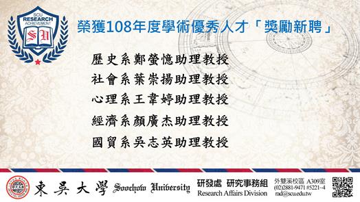 「獎勵新聘」:歷史系鄭螢憶助理教授、社會系葉崇揚助理教授、心理系王韋婷助理教授、經濟系顏廣杰助理教授、國貿系吳志英助理教授,每位教師可獲獎勵金12萬元。