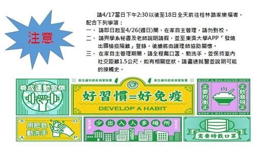 一、 請即日起至4/26(週日)間,在家自主管理,請勿到校。