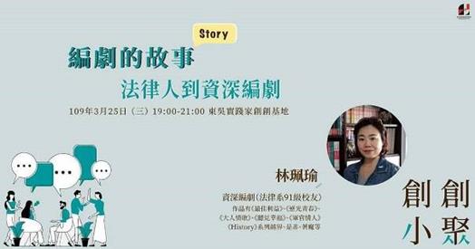 你也有編劇夢嗎?想知道怎麼當編劇嗎?東吳實踐家創創基地於109年3月25日,舉辦「編劇的故事:法律人到BL劇教母」活動,邀請到本校法律系91級畢業校友,現為資深編劇—林珮瑜學姊,與在場的同學們分享,從法律人跨到編劇的過程,以及當編劇的心路歷程。