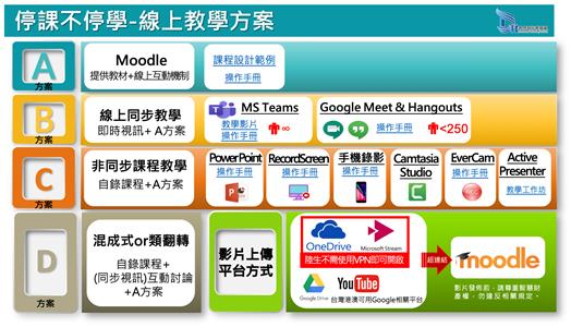 1.同步式:以學校教師熟悉的Moodle平台,搭配Zoom、Microsoft Teams、Google Meet等同步遠距軟體,配合影音串流,提供學生複習。