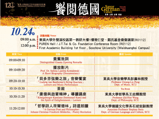 109年10月24日上午於雙溪校區普仁堂邀請音樂學系彭廣林老師、哲學系王志輝老師和德國文化學系石斌宏老師分別從音樂、哲學及文學等面向,以「貝多芬弦樂之旅」音樂饗宴導聆、「康德與啟蒙精神」講座及「哲學詩人荷爾德林」詩選朗讀,帶領師生領略德國文化風情,活動精采可期。