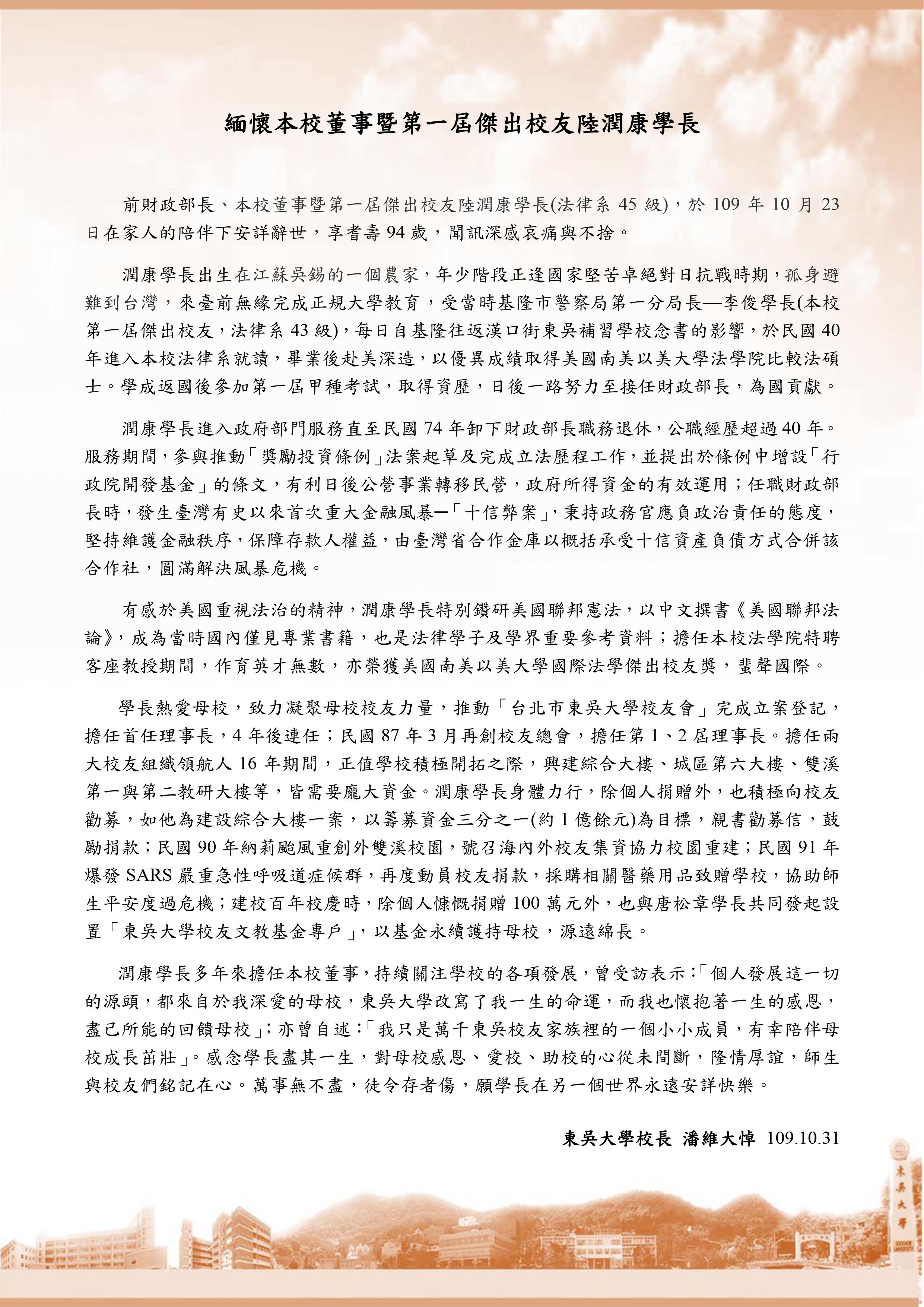 東吳大學校長 潘維大悼 109.10.31