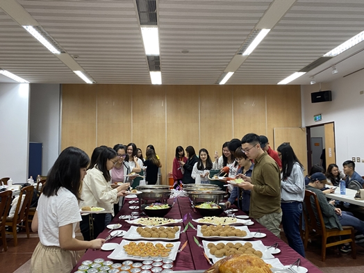餐點開動前,由艾倫達老師帶著全體師生進行禱告,全系師生手牽手圍著一桌豐盛的食物,在溫馨的氛圍裡,傳遞每個人心中的感激,感謝平安順遂的一年、感謝師長朋友的陪伴、感謝身邊親人的照顧。即使在動盪不安的2020年,能夠與系上同學與師長坐下來共同吃一頓飯,也是非常幸運與難得。期盼日後英文學系活動也能有更多同學參與,一起享受美好的節慶時光。