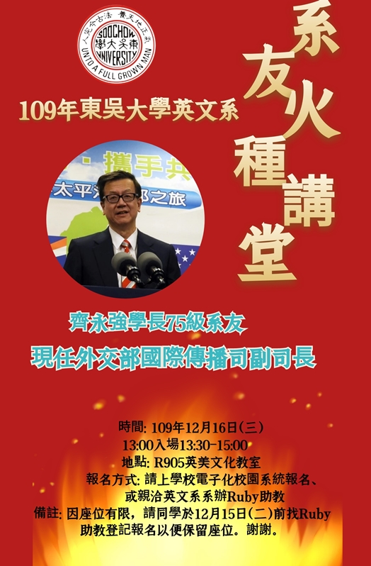 人們總說:「當上帝為你關了一扇門,祂同時會幫你開一扇窗」,在英文系的火種講堂,幾位系友們的跨領域經驗充分的體現了這句話。火種講堂之所以存在,就是希望可以藉由畢業系友將自身經驗傳承給學弟妹,以擴張學弟妹的思考與眼界。本學期英文系在外雙溪校區舉辦了4場火種講堂,總共邀請5位英文系系友回來母校進行演講,分別是齊永強系友(75級)、姜建男系友(83級)、詹妍玲系友(85級)、賴世麟系友(103級)以及李孟安系友(105級)。