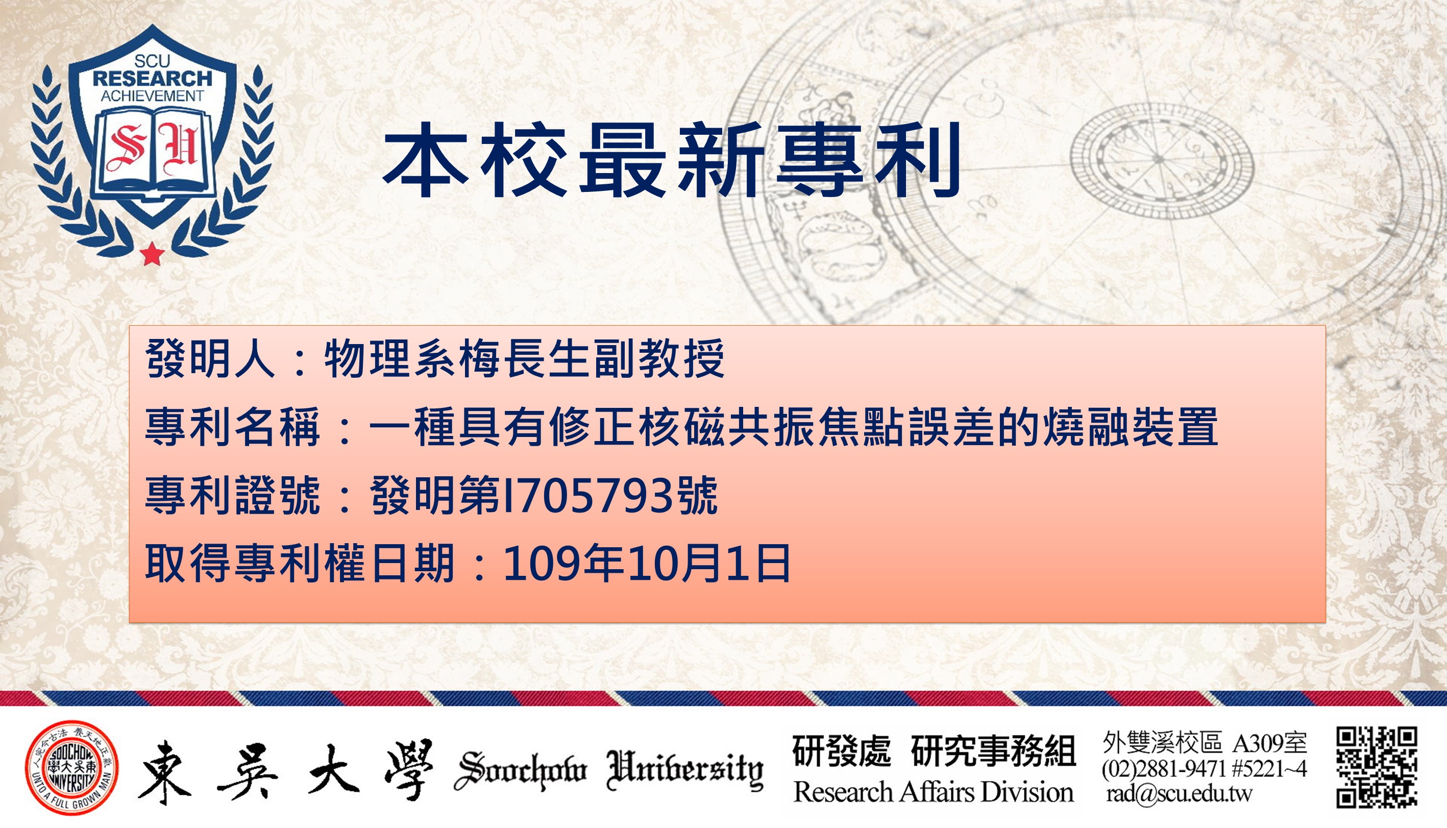 本校最新獲證之專利為物理系梅長生副教授自行研發之研究成果: