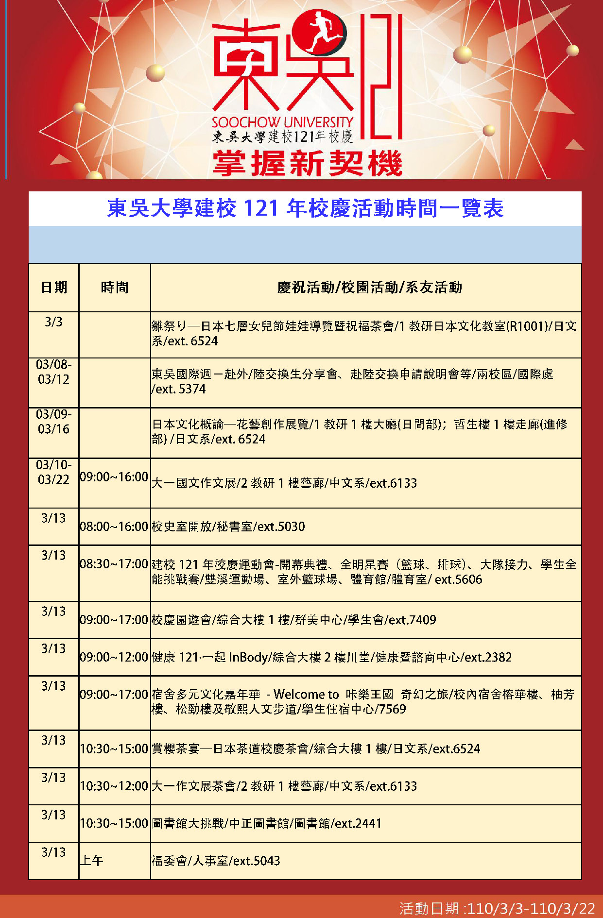 歡慶本校建校121年,校慶典禮暨運動大會將於3月13日舉行,今年活動豐富精彩,包含運動會、園遊會、宿舍嘉年華、賞櫻茶宴等。更特別舉辦「漫遊奧運在東吳」活動,為奧運選手們加油,歡迎全校師生共襄盛舉,並誠摯邀請校友回娘家團聚同慶。