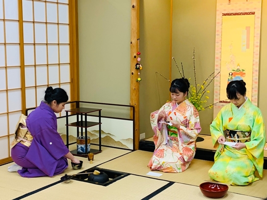 導覽結束後,由吳美嬅老師講解參加茶會的主客,在茶室裡進退應對的禮節,將茶道「和敬清寂」修練心靈,以客為尊的精神,透過茶道社員的示範,介紹給師生。