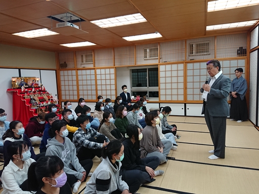 活動當天,董保城副校長親臨會場為本校學生祈福,帶給眾人無比驚喜。董副校長於致詞中舉自己留學德國的經驗,表示要認識一國文化,唯有多置身於該國文化的氛圍中才能有更深入的領略,鼓勵學生踴躍參加此類有意義的文化活動。接著由曾是日本茶道社社員廖逸圳指導老師講解女兒節習俗由來,導覽欣賞每個娃娃。女兒節源自中國周代,人們在三月三日(農曆)「上巳節」這天來到水邊,進行消除穢氣的「祓禊」,即王羲之於〈蘭亭集序〉中提到的「修禊事也」,後來於日本平安時期由唐朝傳至並流傳至今。