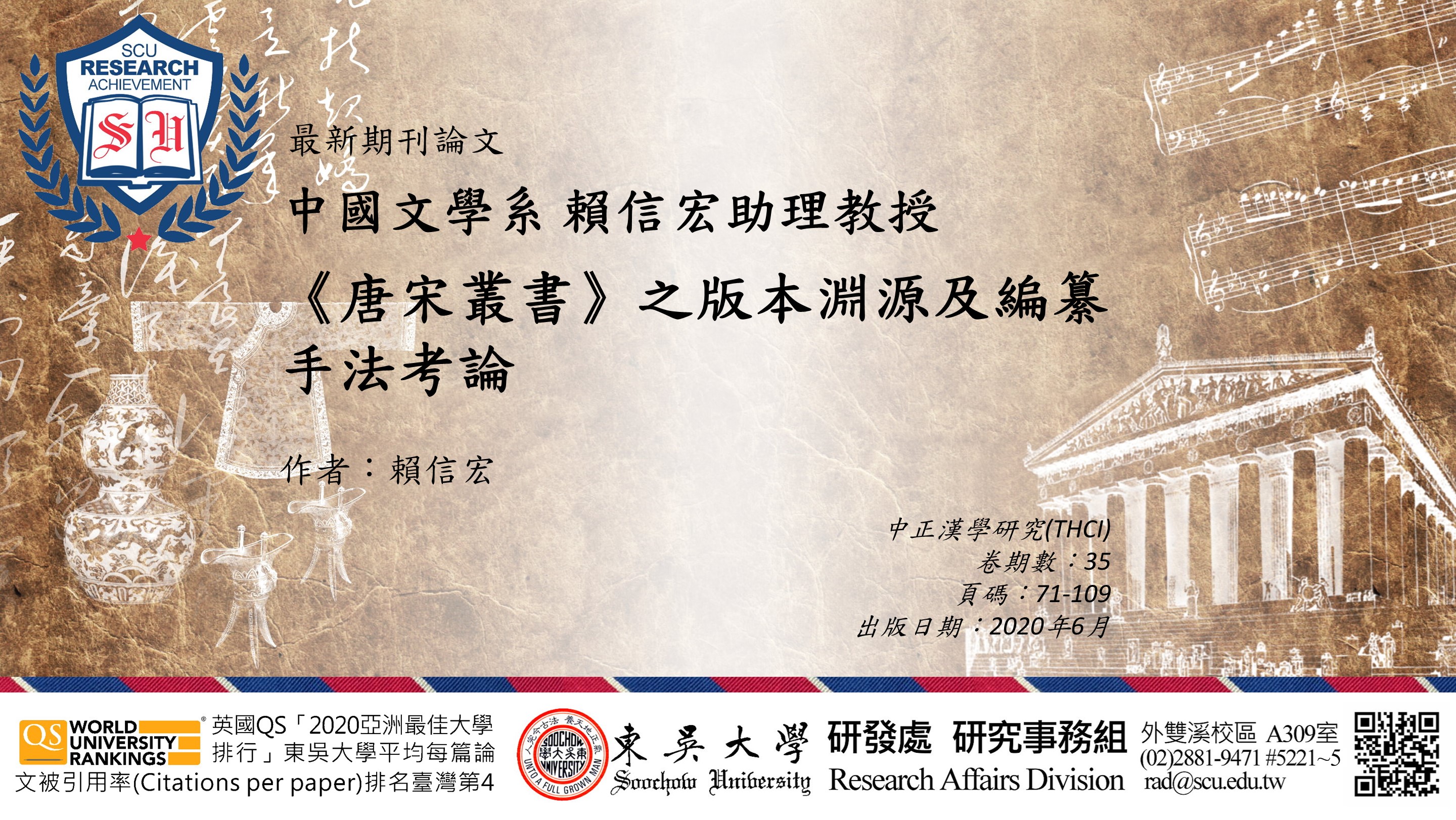 研究事務組小提醒:教師如有最新發表於AHCI、SSCI、SCI、EI、TSSCI、THCI、「東吳大學外語學門獎勵名單」之期刊論文,歡迎將相關資訊e-mail至rad@scu.edu.tw,研究發展處將會公告於校園頭條,以廣交流。