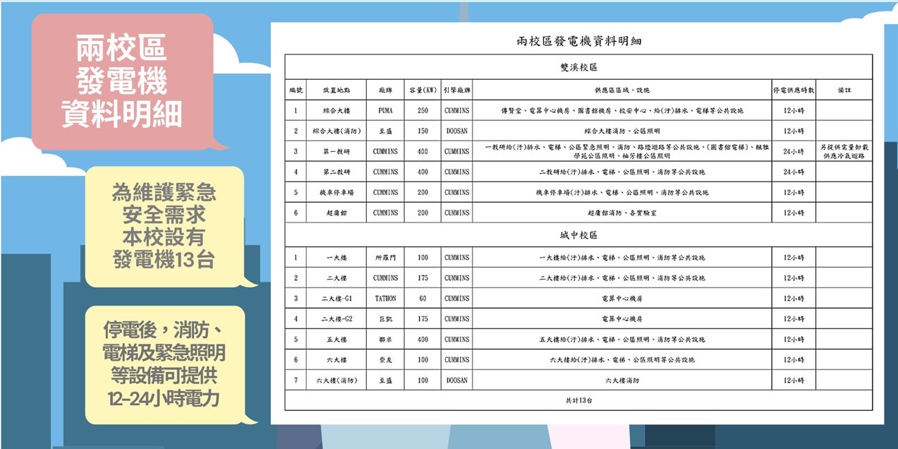 本校為因應臨時停電突發事件、維護緊急安全需求,設有發電機13台,於停電後可提供12-24小時電力供給消防、電梯及緊急照明等設備備援使用。若停電期間正搭乘電梯上下樓,切莫驚慌、保持冷靜,車廂乘客可按壓電梯內部求救鈕五秒以上對外聯繫通報,而發電機備援電力將於1-2分鐘後自動送電,恢復電梯動力至樓層出口,停電後將按照標準程序檢修電梯設備,確保正常無虞。
