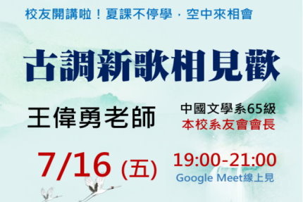 「東吳校友開講啦!夏課不停學」線上活動,第2場與第3場活動分別於110年7月9日、16日(五)晚間舉行,參加人數達363人,這兩場活動由本校第5屆傑出校友王偉勇學長(中文系65級)帶來精彩的演講。7月9日晚間的活動,由本校潘維大校長親自歡迎偉勇學長,王淑芳社會資源長擔任引言人。潘校長表示,特別喜愛偉勇學長的詩詞吟唱,尤其是學長對詩詞的表達,透過吟唱的方式呈現,讓人感到耳目一新,難以忘懷。