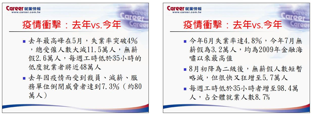 臧老師首先就疫情衝擊分析今年與去年的就業市場,今(2021)年6月的失業率高達4.8%,比2009年金融海嘯時來得還高;相對地,去(2020)年的失業率就沒有那麼高,究其原因有兩點,其一是去年很多人參加國考、研究所等沒有出來找工作,其二則是無薪假造成低就業率。