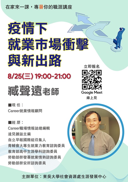 生涯發展中心在暑假期間持續於每週三晚間舉辦「在家來一課,專『暑』你的職涯講座」線上演講,最後一場講座於110年8月25日(三)晚間7時至9時舉辦,為7場系列活動畫下圓滿結尾。此次邀請到曾任Career職場情報誌總編輯、遠見雜誌主編、自立早報國際組召集人,現為Career就業情報顧問的臧聲遠老師與大家分享「疫情下就業市場衝擊與新出路」。