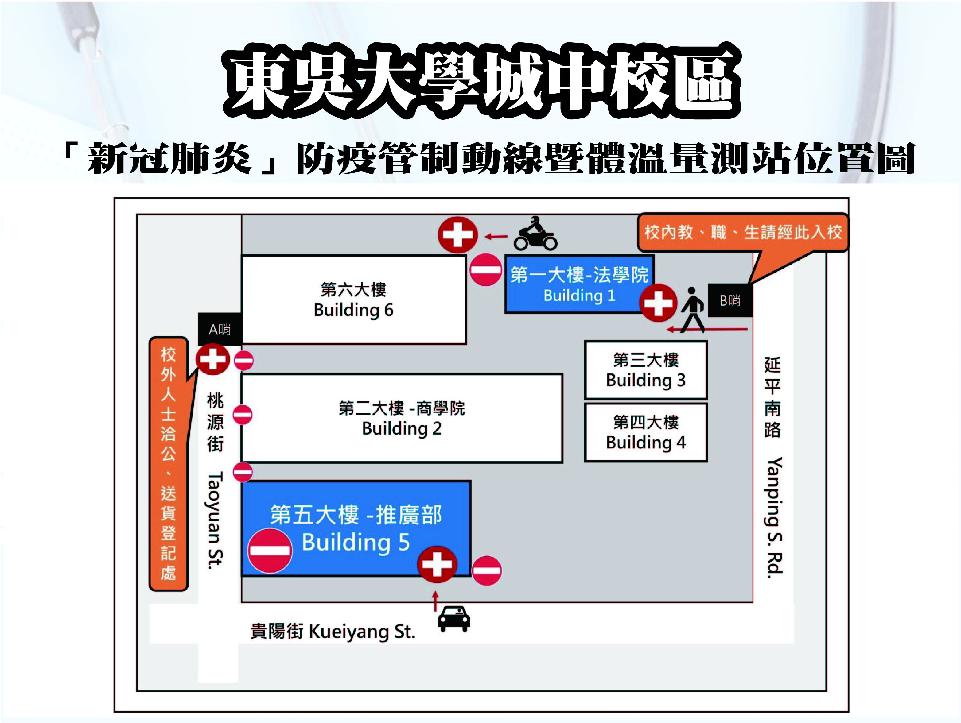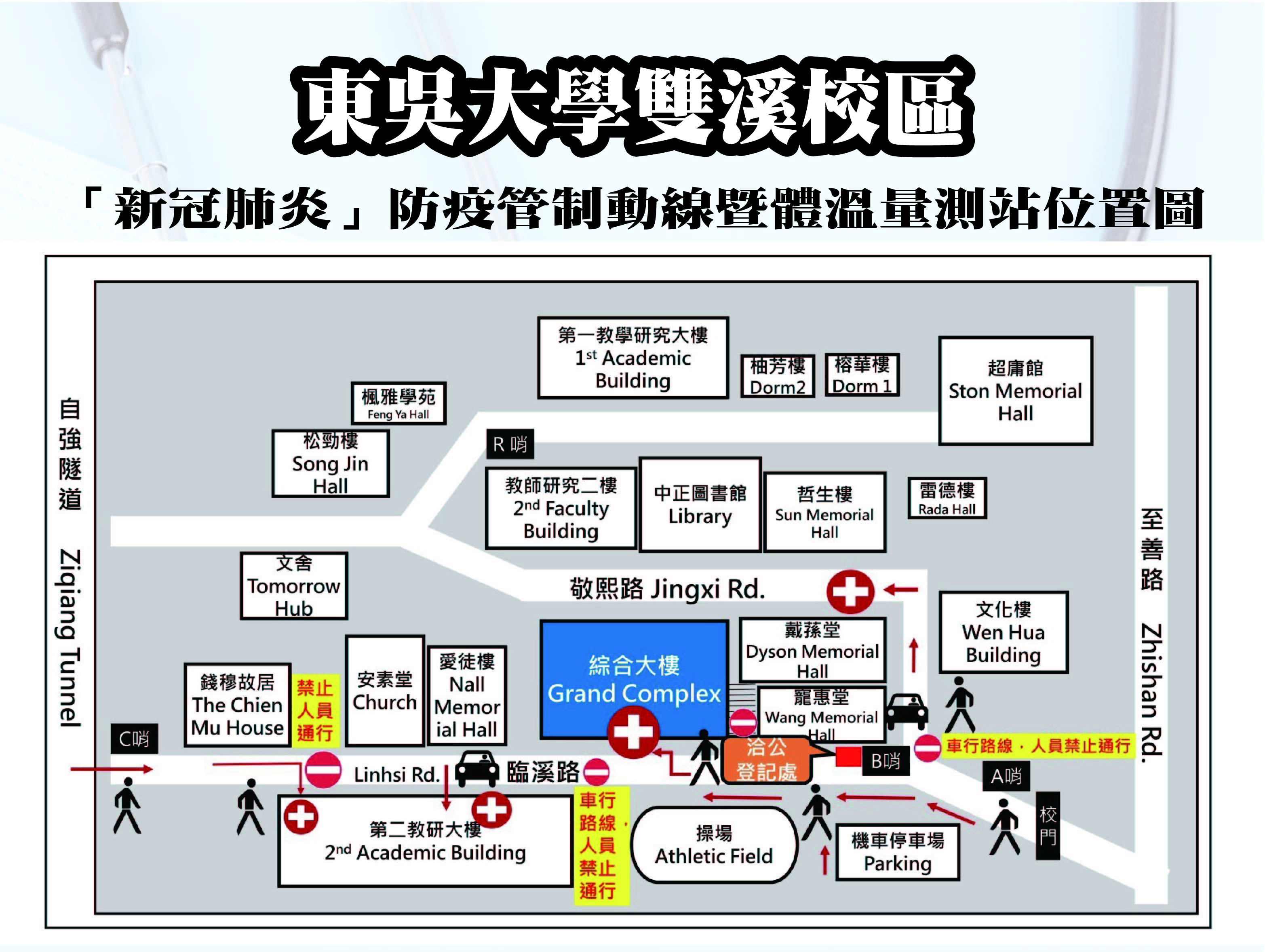 A.行走路線由臨溪路入校或搭公車者,請一律由B棟綜合大樓一樓量溫。另由自強隧道(C哨)入校者,請由D棟(二教研)側門入內量溫。