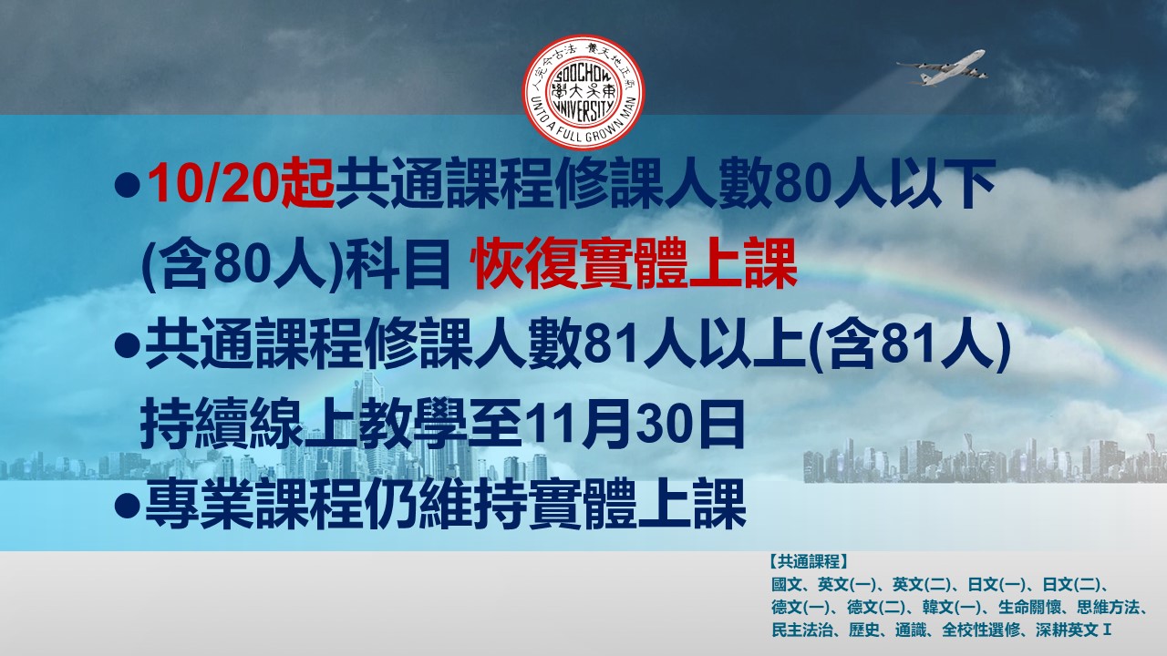 二、共通課程自10月20(三)起,修課人數80人以下(含80人)科目恢復實體上課,81人以上(含81人)仍持續線上教學至11月30日。