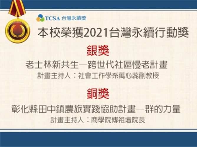 財團法人台灣永續能源研究基金會(TCSA)辦理之2021首屆「TSAA台灣永續行動獎」頒獎典禮,於110年10月13日假台北市圓山大飯店舉行。該獎項共吸引138個單位參獎(大學計38所),最終評選出190件永續行動方案(大學計48件)。本校共報名2件參獎,「老士林新共生-跨世代社區慢老計畫」榮獲銀獎、「彰化縣田中鎮農旅實踐協助計畫—群的力量」則榮獲銅獎,由趙維良副校長代表出席領獎。