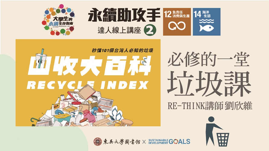 110學年度圖書館「大學生的永續生存指南」系列活動,第二場講座「永續助攻手-必修的一堂垃圾課」於110年10月13日13時至14時30分線上舉行,邀請環保組織《RE-THINK 重新思考》講師劉欣維先生,分享海洋垃圾的形成與垃圾的循環,帶領大家重新認識垃圾分類。