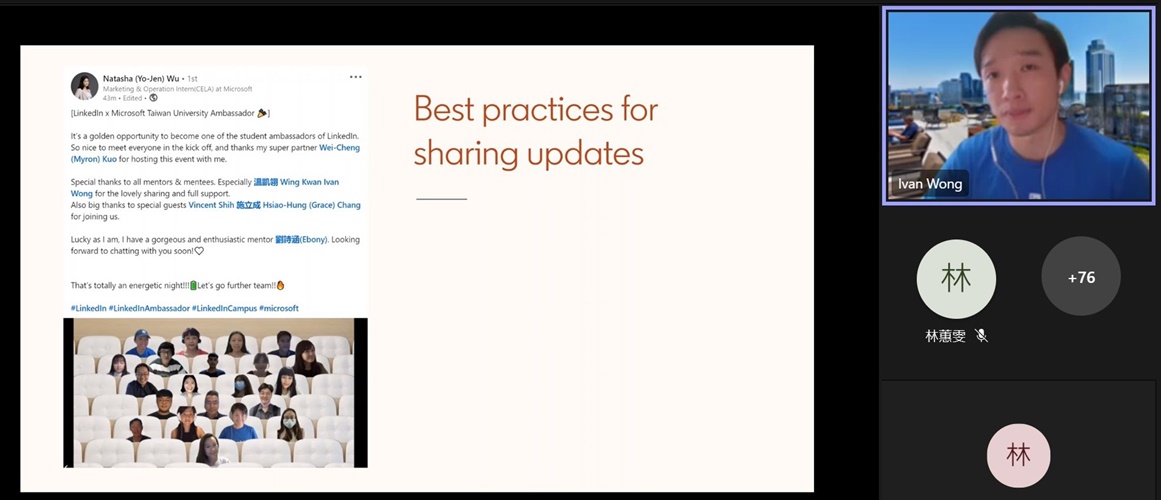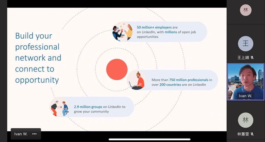 在揮別校園邁入職場前,未來的不確定性是否讓人感到徬徨與不安?本校學生學習資源組於110年10月20日在線上舉辦「LinkedIn主題式工作坊」,邀請LinkedIn北亞區公共事業部負責人Ivan,帶領同學們學習如何使用LinkedIn平台,幫助正在為未來感到迷惘的同學規劃與展現個人的職涯。