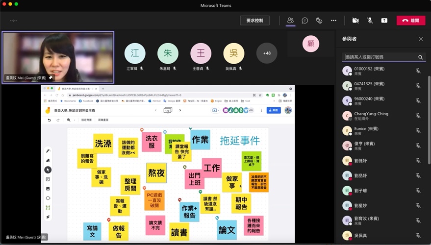 「拖延」成為現代人的一種常態,發生原因可能為任務過多、標準過高、猶豫不決,進而阻礙行動力。人的行為模式是固定的,拖延也有一定的循環,而且每個人或多或少都會面臨拖延的問題。盧講師請同學在雲端白板寫下最近拖延的事件,接著思考目前卡住時自己的反應為何,並試著在每次想拖延時「提早」一步開始行動。針對因自己設立的高標準而產生的拖延狀態,嘗試設定合理的階段性小目標,衡量時間精力,以減少失敗焦慮;而面對預想與結果所產生的落差感,要優先留意。只有了解自己的行為模式,才有改善拖延的可能性。