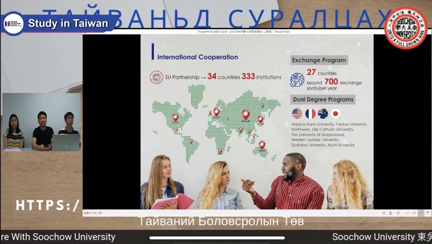 在招生宣講方面,為突破無法親赴國外、與學生面對面的困境,國際事務中心積極參與各地區線上教育展,本學期已進行多場的英文及日文線上招生活動,包括日本、泰國、印尼、菲律賓、蒙古等,主要內容為介紹國際商管學程、跨領域國際學士班及華語課程,期盼增加東吳在海外地區的知名度,拓展非華語地區的生源。