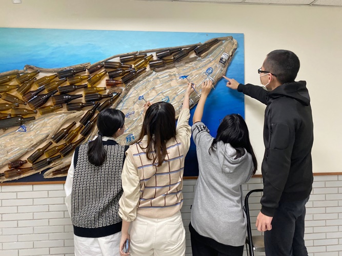 學務處系列活動的開端是北海岸淨灘,面對一望無際的海灘上散布大大小小的廢棄物,學生們絲毫不畏懼,愈撿愈起勁,而這些被拾起的海洋垃圾,會被妥善清理、加工製作成裝置藝術並裝飾於校園中,作品從設計發想、素材拼裝、顏料上色等皆由本校師生參與、動手實作,過程中先是互相合作組裝漂流木,而後一筆一畫刷上濃淡色彩,藉由群育及美育的融合,啟發學生探索人際與自然關係的思考,亦培養學生對於美的認識與創造力。