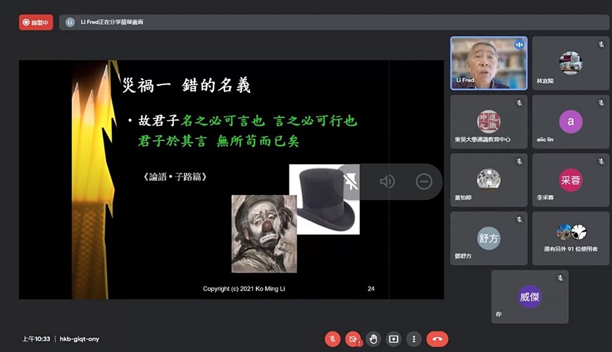 本校通識教育中心於110年12月15日舉辦線上講座「向經典學說話-溝通無礙的藝術」,邀請中華儒道研究協會理事長李克明,與同學們一起透過中華經典發現「老智慧」,以「新思維」掌握說話的藝術,讓大家在日後面臨人際互動難題時,不必搜索西方理論,也能在棘手問題上迎刃而解。