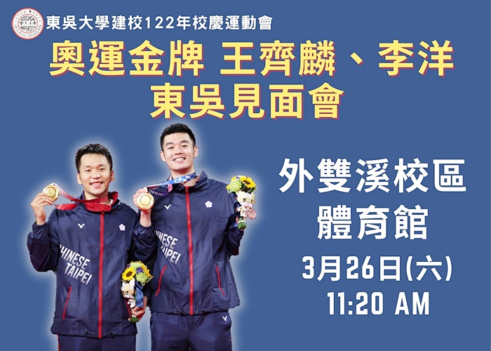 東吳大學建校122年校慶典禮暨運動大會,訂於111年3月26日(星期六)在外雙溪校區盛大舉行。今年更特別邀請到東京奧運超級人氣、風靡全台灣的男雙羽球金牌國手—王齊麟與李洋,蒞臨與師生們見面。他們在球場上不畏挑戰,越戰愈勇的精神令人敬佩,同時也呼應本次的校慶主題「創造新時刻」,展現東吳師生熱情活力、創造無限可能。