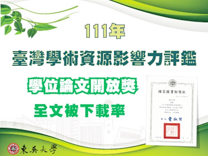 國家圖書館對於保存文化,弘揚學術研究之願景,亦是本校致力的目標,因此長期以來致力落實學位授予法之相關規定,鼓勵學位論文公開發表,藉以呈現本校學術研究成果。此次於電子全文授權數、被下載數及被下載率三項評比皆入圍私立大學組前五名,並且於「臺灣博碩士論文知識加值系統」內各分項排名積分總分最高之大學校院中,榮獲私立大學組第四名,顯見本校研究成果備受學術界的認可。而本校《東吳日語教育學報》及《東吳法律學報》分別奪得語言學類及法律學類期刊即時傳播獎,其學術研究力近五年影響係數高居全臺前五,足見本校學術水準在研究領域中具有指標性的重要意義。