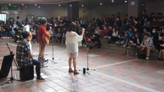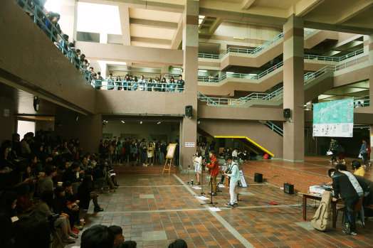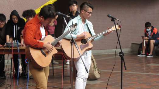 動聽的歌聲伴著鏗鏘有力的吉他刷弦聲從望星廣場散播開來,3月30日中午時分環繞整棟綜合大樓,吸引不少下課的同學倚靠欄杆駐足聆聽,更有人帶著買好的午餐,早早在望星廣場卡位準備欣賞新生代樂團Control T的表演。