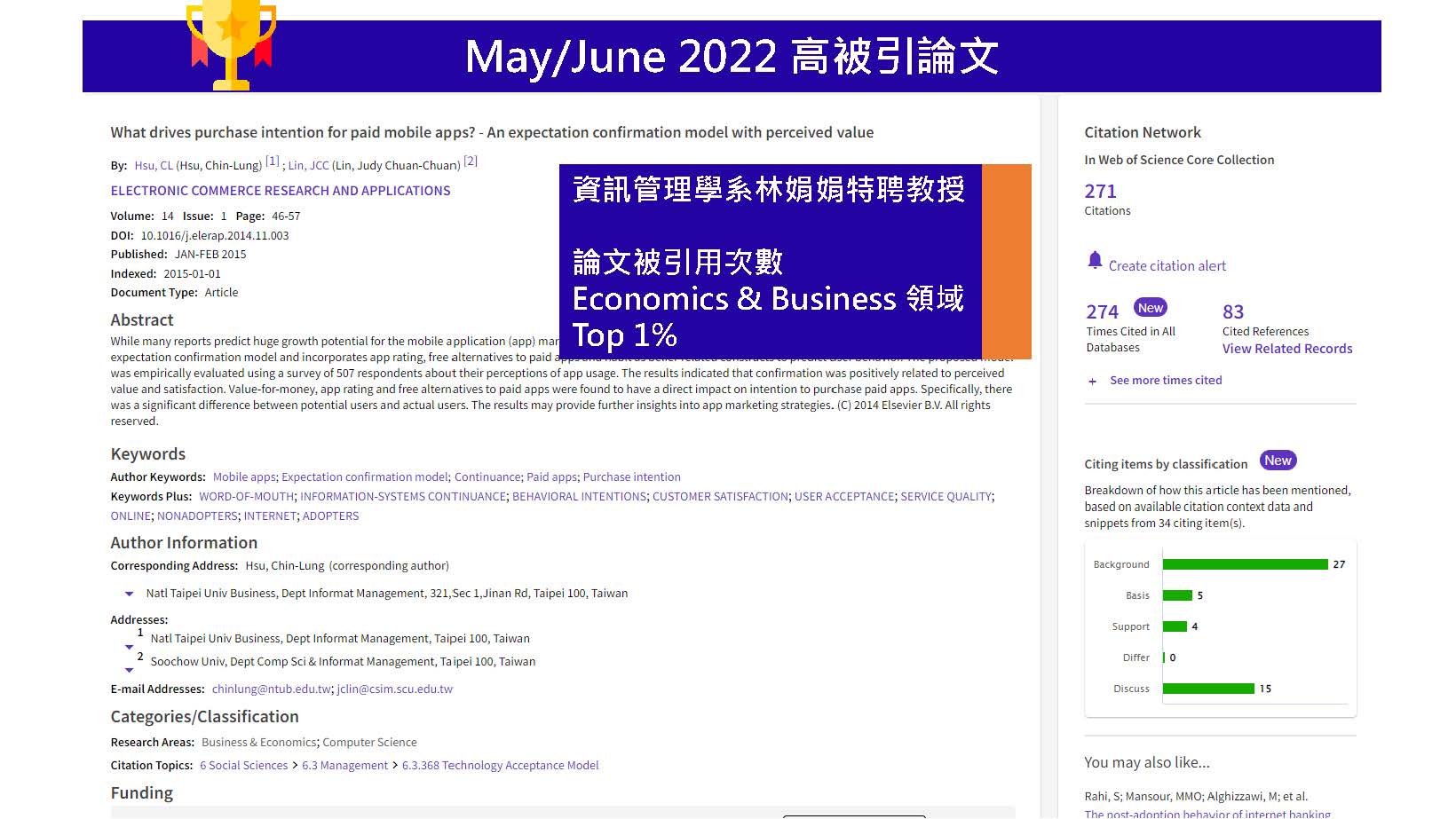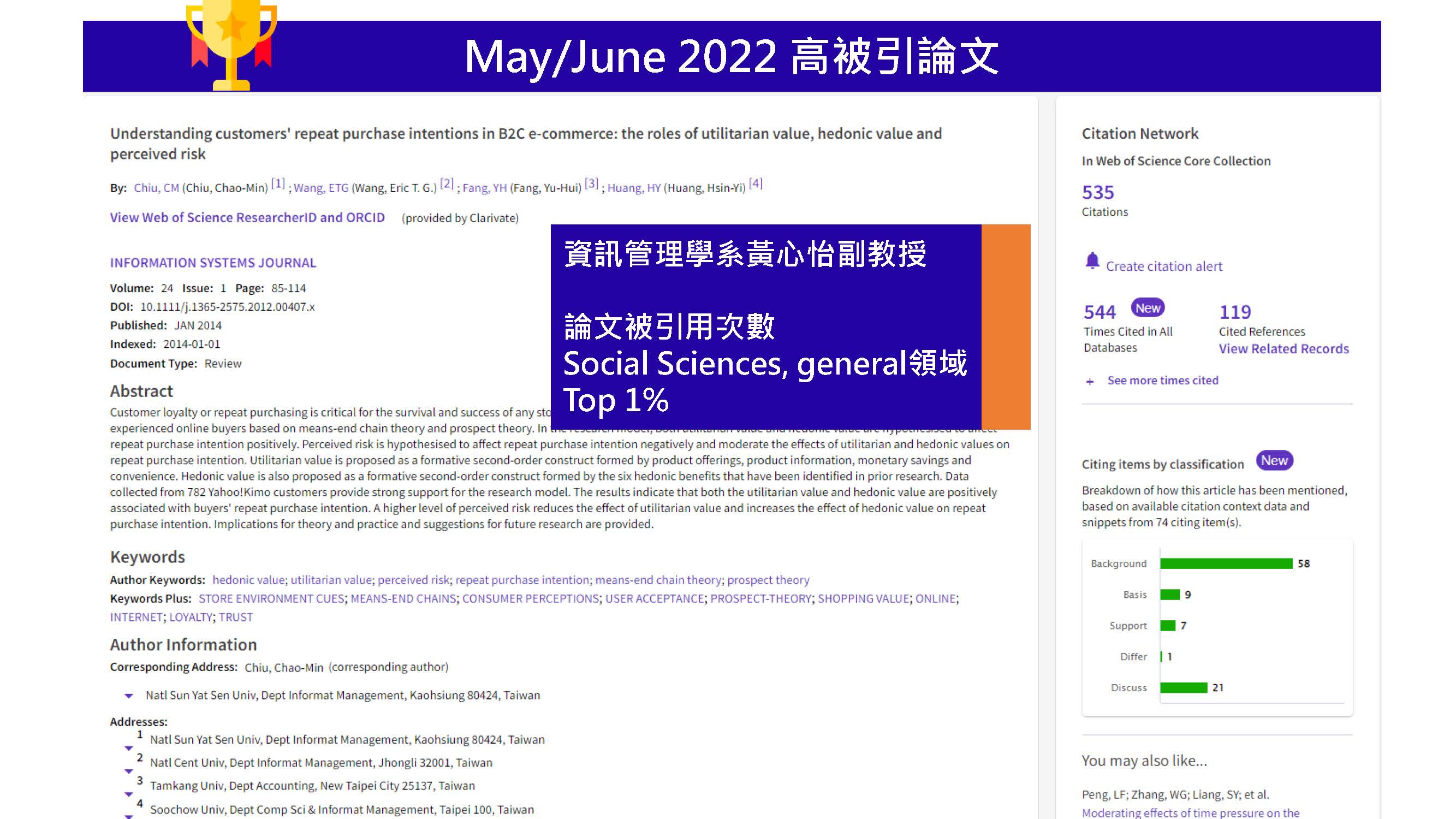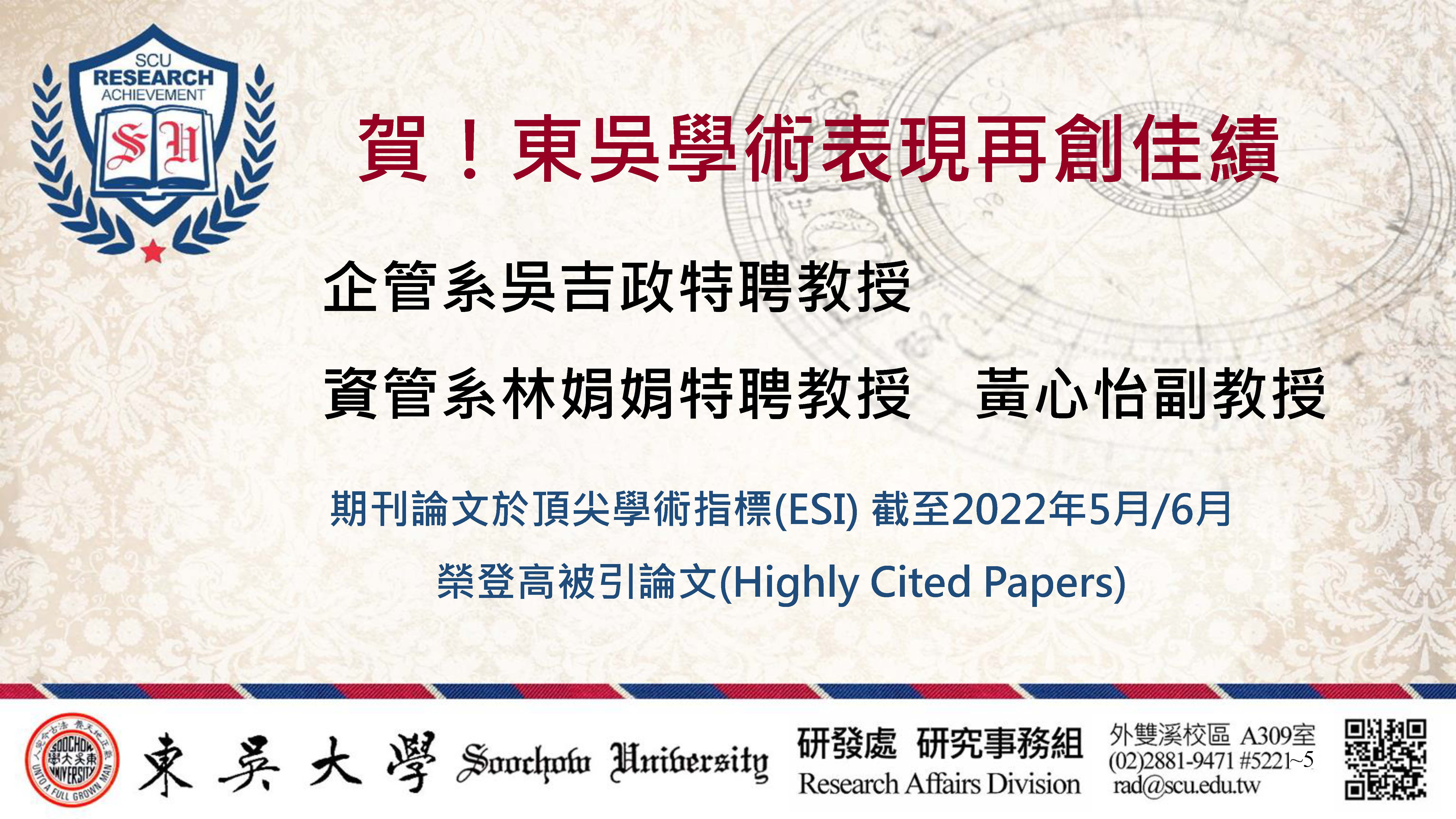 東吳學術表現再創佳績!本校企業管理學系吳吉政特聘教授、資訊管理學系林娟娟特聘教授、黃心怡副教授3位教師之4篇論文於頂尖學術指標(Essential Science Indicators,ESI)中,截至2022年5月/6月,其論文被引用的次數足以使其列為相關學術領域的前1%,極具影響力,詳細資料如下: