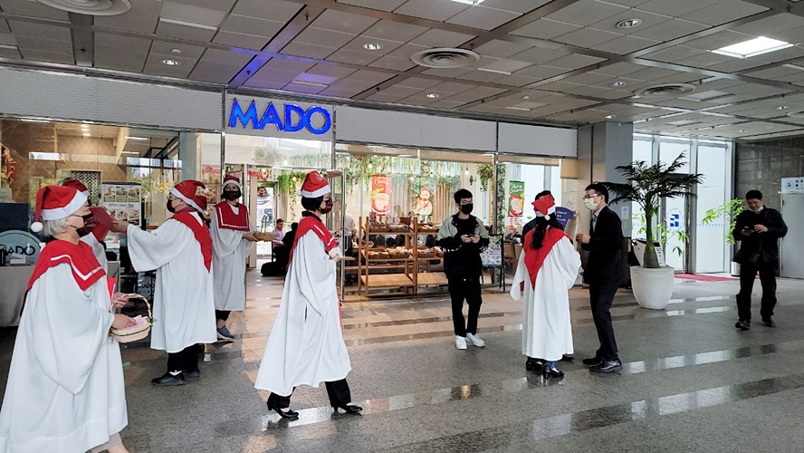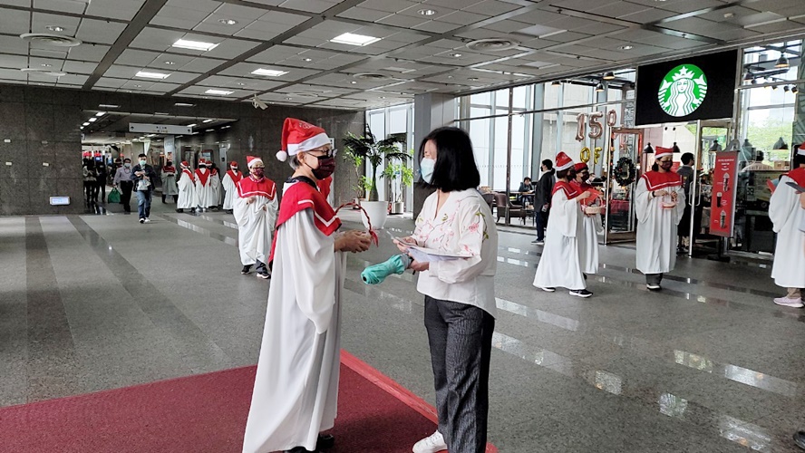 時序進入聖誕節期之際,本校產學合作夥伴經濟部工業局南港軟體工業園區服務中心為讓園區員工一同歡慶迎接聖誕節,特別於111年11月30日中午在南軟園區一期A棟大廳,舉辦「讓愛發光─南軟聖誕節點燈儀式」,並邀請本校校牧徐秀蓉牧師祝福禱告,以及教職員團契及安素堂弟兄姊妹等23人組成聯合詩班獻詩,場面溫馨。