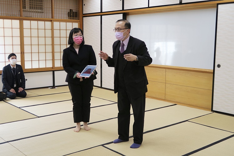 國際事務中心蘇克保主任親自接待日本貴賓,並以漫步校園的方式,詳細導覽外雙溪校園的各項設施,隨後並由外語學院王世和院長及日文系賴雲莊副主任介紹日本文化教室,說明本校學生如何透情境式教學學習日本文化。由於目前跨領域學士班有14位日本學生在校學習,研習團成員也特別至該班級見習,瞭解不熟諳華語的日本學生上課情形。
