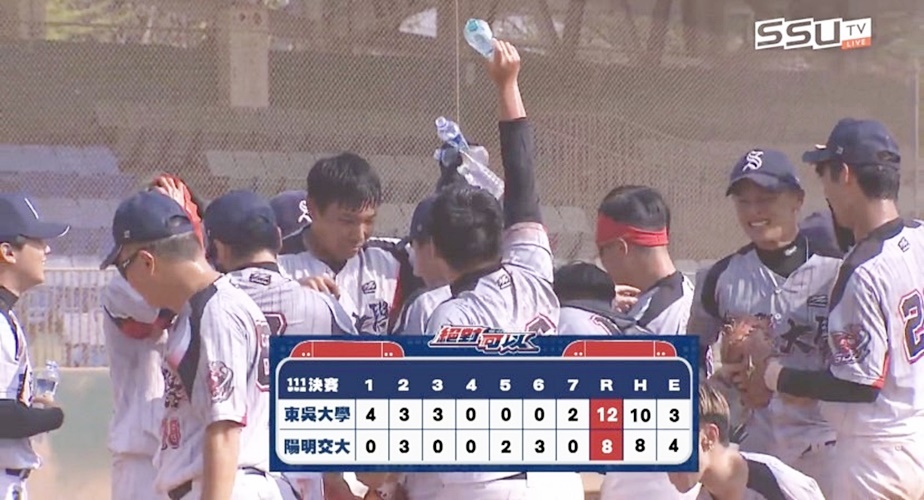 在全民瘋世界棒球經典賽的同時,111學年度全國大專院校棒球運動聯賽(一般組)全國賽於3月5日在高雄開打,以一天一場單淘汰的方式進行,東吳大學棒球代表隊以僅有三名投手的陣容下,遭遇臺灣體大、輔仁大學、中央大學、東海大學、南應科大(八強)、清華大學(四強),一路過關斬將最終在12日以12比8擊退陽明交大,奪得隊史首冠,此也是校史首冠,東吳師生與有榮焉。