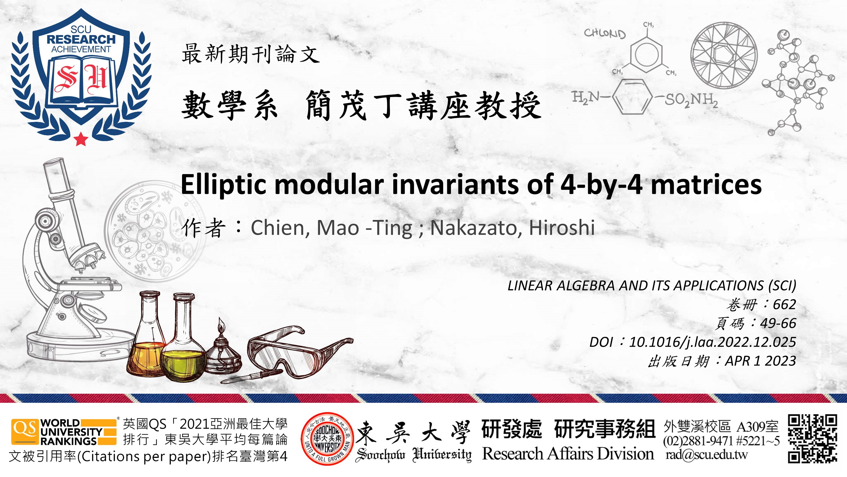 研究事務組提醒:教師如有最新發表於AHCI、SSCI、SCI、EI、TSSCI、THCI、「東吳大學外語學門獎勵名單」之期刊論文,歡迎將相關資訊e-mail至rad@scu.edu.tw,研究發展處將會公告於校園頭條,以廣交流。