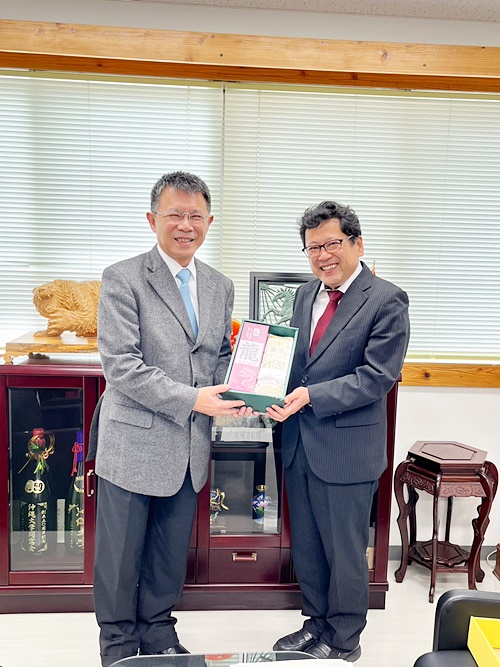 訪問團接著飛抵沖繩,第五站訪問沖繩大學,受到沖繩大學校長山代寛(Hiroshi Yamashiro)及師長們熱情的接待,本校2020年與沖繩大學簽訂校級學術交流及學生交換協議展開合作。此次參訪,外語學院王世和院長也特別邀請該校國際溝通學科渡邉ゆきこ學科長,亦是「2022年度日本e-Learning大賞 VR活用教育特別部門賞」得主,3月13日至本校以「虛擬實境在華語教學上的運用」為題進行中文演講,分享線上互動性教材製作與應用之經驗。